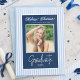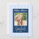 Celebrate your graduate in style with this elegant blue and white graduation announcement card, featuring a classic script design, soft striped background, and a personalized photo of your graduate. Perfect for sharing this milestone moment with family and friends, this design blends timeless charm with a modern, preppy aesthetic. Ideal for high school, college, or university graduations.