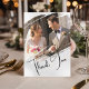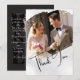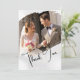 Modern simplicity. This wedding thank you card features a creative way to present your Wedding photos while thanking your friends and loved ones. Featuring your photos within creative hand painted style brush strokes with a flowing handwriting inspired script. The elegant trendy black and white design creates a timeless keepsake to cherish. This is the perfect card to express sincere thanks.