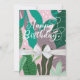Modern and elegant floral "Happy Birthday" flat greeting card. Features tropical plants, leaves, and flowers, white script lettering, and room on the back for a special message. For special requests, feel free to message the shop for custom designs, i.e. layout, color, or theme.