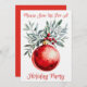 A Modern Elegant Holiday Party Invitation designed with a bright festive red ornament with green leaf and holly accent, on a white background. The front text includes: Please Join Us For A Holiday Party. The reverse text includes: The Date and Time, The Location and Address, The Host Details and RSVP Details, on a matching festive red background. To personalize, simply insert your party details into our easy template, replacing the sample text.