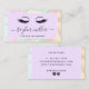Gorgeous eyelash extensions business card design featuring colorful faux holographic texture, violet color block, lashes and elegant calligraphy font.