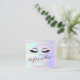 Gorgeous eyelash extensions business card design featuring colorful faux holographic texture, lashes and elegant calligraphy font.