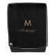 A modern, elegant monogram design with gold handwritten minimalist script typography and sans serif block typography on an elegant black background.