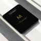 A modern, elegant monogram design with gold handwritten minimalist script typography and sans serif block typography on an elegant black background.