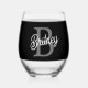 Modern Elegant Monogram Name Black Gray Script Stemless Wine Glass