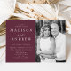 Plain white envelopes are included with paper invitations and will come to fit the invitation size you select. If you don’t need the envelopes, you may choose to not receive them by selecting the dropdown below "Envelopes" and choosing "None." If you’d like to have a design on your envelopes, you can browse all of these available envelopes to find the design that complements your Modern Elegant Wine Photo Wedding Invitation.