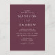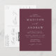 Minimalist, modern wedding invitation postcard featuring your wedding details in white lettering with calligraphy script accents. The wine-purple background can be changed to a color of your choice. Personalize the back of the chic wedding invitation postcard with your return address, desired response date, wedding website, and instructions for guests using the text templates provided. Designed to coordinate with our Modern Elegance wedding collection.