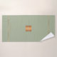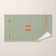 Trendy luxury exclusive looking monogrammed bath towel set featuring a faux gold copper metallic glitter square and lines over a stylish classy light olive sage green background. + Personalize it with your name or family name and monogram name initial.