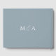 Elegant wedding guestbook featuring "the wedding of" displayed in a modern white calligraphy script on a dusty blue background. Personalize the front of the simple wedding guest book with your names and wedding date. The back of the dusty blue guest book displays your monogram initials. Add your married name and wedding date to the spine of the guest book.