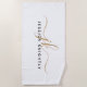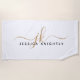 Personalized modern beach towel with simple, fancy script initials or monogram and name in your choice of color combinations (shown in gold and black text against an editable white background) for a stylish look. CHANGES: Change the background color, choose a styled graphics background or change the text font style, color, size and placement in EDIT for a custom design. ASSISTANCE: For help with design modification or personalization, color change, resizing, transferring the design to another product or would like coordinating items, contact the designer BEFORE ORDERING via the Zazzle Chat MESSAGE tab below or email makeitaboutyoustore@gmail.com.