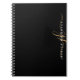Personalized modern notebook with simple, elegant handwritten calligraphy script initials or monogram and name in gold and white against an editable black background for a stylish or professional look. CHANGES: Change the background color, choose a styled graphics background or change the text font style, color, size and placement by clicking on EDIT in the PERSONALIZE section for a custom design. ASSISTANCE: For help with design modification or personalization, color change, resizing, transferring the design to another product or if you would like coordinating items, contact the designer BEFORE ORDERING via the Zazzle Chat MESSAGE tab below or email makeitaboutyoustore@gmail.com.