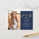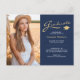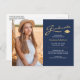 This double sided 2 photo stylish graduation announcement or thank you postcard, features modern text fused with elegant calligraphy script in gold color and white on navy blue. Photos are one on the front and one on the back. To see more items like this, visit my store here at "www.Zazzle.com/LakeViewCardCo". Thanks