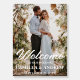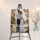 The word "Welcome" is rendered in a beautiful, flowing script calligraphy, set against your picture. Below, your names and wedding date are clearly displayed in a clean, modern font. This sign is fully customizable to match your celebration's details.