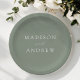 The elegant, personalized sage green wedding paper plates are perfect for your wedding reception, rehearsal dinner, engagement party, and more! The minimalist sage green wedding plates are perfect for summer, fall, winter, and spring weddings. The design features a chic modern calligraphy script with your names in white lettering on a sage green background. The design coordinates with our Modern Elegance Sage Green wedding collection.