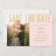 Unique wedding photo Save The Date. Blush pink background. Gold lettering (gold is not real gold but color). Modern streamlined font. Truly unique, simple, and elegant. For summer wedding, spring wedding, or any kind of modern elegant wedding.