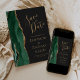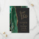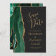 The left-hand edge of this elegant modern wedding save the date card features an emerald green watercolor agate border trimmed with faux gold glitter. The customizable text combines gold-colored handwriting, copperplate and italic fonts on a slate black background. The reverse side features a matching emerald green and gold agate design.