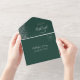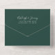 The left-hand edge of this elegant modern all-in-one wedding invitation and RSVP features a silver faux glitter border. The customizable text combines silver gray whimsical handwriting, copperplate and italic fonts on an emerald green background. The return address appears on the outside flap and the reverse side of the detachable RSVP card in silver gray text on solid emerald green.