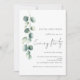 Modern Sage Eucalyptus Wedding Evening Party Invitation. Available dgitally and printed. A Minimalist botanical style to invite your evening wedding guests. A set handwritten script for Evening Party and the rest of the text you can easily personalize. An elegant branch of watercolor eucalyptus leaves runs down the left hand side.