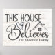 Poster features the words "This House Believes" in a gray scripted font against a faux distressed wood planked cream colored background. Design details include a heart with a Christian cross and a house rooftop. Add your family name or custom text to make this poster uniquely yours. You can also order with frame for a finished look upon arrival.