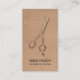 Elegant fully customizable business card template with PRINTED kraft paper background, black scissors icon. Modern elegant design for hair studio, hair stylist.