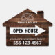 This faux wood open house sign with directional arrow will grab drive by traffic attention and pique curiosity. Customizable double-sided Open House sign in the shape of a house.