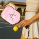 This modern, feminine monogram pickleball paddle features a trendy pink watercolor background. Personalize it with your initial and add your name in a black signature handwriting script. Complementary items are available. Order yours today!