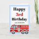 A cute fire truck illustration is featured on this red and blue boy birthday card.