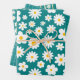 Whimsical modern gift wrap set featuring scattered flat white daisies with sunflower gold centers over a bold teal blue background. Set includes scattered daisy pattern with coordinating grid and daisy stripe patterns. Suitable for any occasion.
