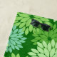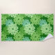 Beach towel in a modern take on a traditional Japanese floral kimono print - stylized flowers in shades of lime green and aqua on a deep emerald green background