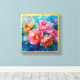 The deep teal and azure background provides a dramatic contrast to the high-energy palette of magenta, coral, and golden yellow, making the floral arrangement practically leap off the wall.