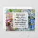 Pretty floral save the date postcards. Affordable marriage announcement with funky, modern text and "love is patient" scripture on the back (can be deleted). A swirly design borders the text on the front.