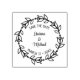 This "Save the Date" rubber stamp features a flower frame with couple names and celebration date.