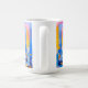 Bright abstract flower fields in blue and gold wrap a glossy white ceramic mug.