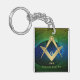 Stylish gold square and compass Masonic symbol personalized keychain with a modern fractal background.