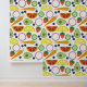 Give your walls a fresh touch with this fruit and vegetable patterned peel and stick wallpaper. This fun, modern style pattern features illustrations of a colorful assortment of fruits and vegetables against a cream colored background. There are orange and lemon wedges, carrots, avocados, blueberries, cucumbers, and strawberries.