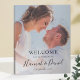 This simply chic wedding welcome sign features your favorite photo and black text, including your first names in a lively whimsical script. You can change the font and the wording to suit your style. Depending on the color of your photo, you might prefer white text-in that case, please check our wedding welcome sign collection for this design in white!