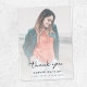 Modern, minimalist photo funeral thank you to express love and thanks following thee celebrate the life of your loved one in a minimalist clean simple design style featuring a handwritten script font and a soft dove gray background. The template can easily be personalized with your own photo and text to create a special tribute for your loved one's funeral, memorial or celebration of life. The image shown is for illustration purposes only to be replaced with your own photo. The placeholder image shows a young woman with long wavy brown ombre hair wearing a leather jacket, orange lace top and white jeans. #funeral #thankyou