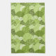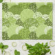 This kitchen towel or tea towel features a geometric pattern of overlapping circles with brush strokes in monochromatic shades of lime green, avocado and celery.