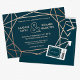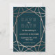 A modern and contemporary winter wedding "Save the Date", features a "faux foil" gold rose geometric pattern over a dark turquoise background. All your details are spelled in a beautiful modern typo.