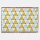 Trendy geometric pattern with mint blue, golden yellow and white triangles.