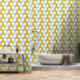 Stylish peel and stick wallpaper with a geometric pattern of mint blue, golden yellow, and white triangles—perfect for adding a modern touch to any room.