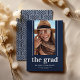 Simple 2025 graduation announcement card featuring a classic navy blue background that can be changed to match any school or favorite color. The main focus is on the graduate themselves – their photo takes center stage, with two sleek lines running down either side to add a touch of modernity. The result? A statement that screams "this is the grad!". And of course, their name, school/college, and class year are elegantly displayed, making sure everyone knows who the star of the show is. The bold, geometric pattern on the back adds a touch of sophistication, without taking away from the front.