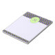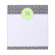 This notepad features a modern geometric pattern using the trendy color combination of purples and greens. A light green circle centered at the top features a customizable monogram.