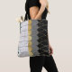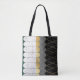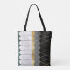 Elevate your style with this chic tote bag featuring a modern geometric pattern. The design showcases a blend of terrazzo and metallic textures, divided into three sections: the left side features a terrazzo pattern with multicolored speckles on a white background, the middle section has a gold metallic texture, and the right side boasts a sleek black background with a gold diamond grid pattern. Perfect for carrying your essentials with a touch of contemporary elegance, this bag is both stylish and functional. Customize it with your slogan or add your name for a unique personal touch.