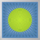 Mid-Century Modern abstract sunburst with a silky, gradient effect - bright lime green on a soft denim blue background, accented with silver