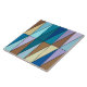 Ceramic tile in a Mid-Century Modern geometric grid of triangles in sea glass colors of cerulean blue, turquoise, aqua, coffee brown, beige and soft violet