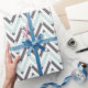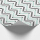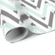 Modern wrapping paper with geometric mint blue, white, gray chevron pattern.