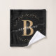 Girly, elegant, trendy, modern, black and gold monogram initial name script custom personalized monogrammed bath towel set. Featuring a monogram initial and a girly name script in a hand lettered calligraphy swash tail font and dotted circle frame around your monogram. Perfect feminine gift for sister, mother, girlfriend, bridal shower, birthday, wedding, sweet 16 birthday party, or anyone who loves pretty girly modern style.