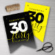 Celebrate the big three oh with this stylish modern design, which features striking block and handwritten lettering set on alternating rich-black-to-smoky-grey and bright yellow backgrounds.
