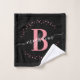 Girly, elegant, trendy, modern, pink and black, white monogram initial name script custom personalized monogrammed bath towel set. Featuring a monogram initial and a girly name script in a hand lettered calligraphy swash tail font and dotted circle frame around your monogram. Perfect feminine gift for sister, mother, girlfriend, birthday, wedding, bridal shower, sweet 16 birthday party, or anyone who loves pretty girly modern style.